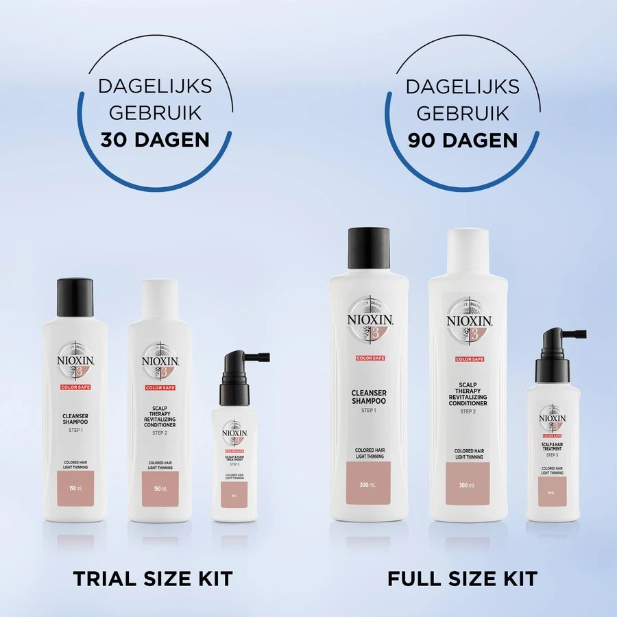 Krijg voller en dikker uitziend haar met het innovatieve 3-delige NIOXIN Systeem 3 voor gekleurd, normaal tot dun uitziend haar. Deze set van 3 haarverzorgingsproducten helpt het haar en de hoofdhuid te reinigen, optimaliseren en behandelen, zorgt voor dikker en voller uitziend haar met een gezonde glans en biedt tegelijkertijd bescherming voor de haarkleur. Het 3-delige systeem bestaat uit drie stappen om de perfecte basis voor dikker, voller uitziend haar te leggen: reinigen, optimaliseren en behandelen. Cleanser Shampoo 150ml helpt talg, vetten en vuil te verwijderen van de hoofdhuid en het haar. Scalp Therapy Revitalising Conditioner 150ml helpt het haar veerkrachtiger te maken en de vochtbalans onder controle te houden. Scalp & Hair Treatment 50ml zorgt voor een frisse hoofdhuidomgeving.